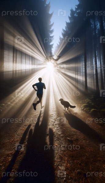 Женщина, бегущая со своей собакой по лесной тропе, окутанной густым эфирным утренним туманом с лучами солнца, фильтрующимися через навес