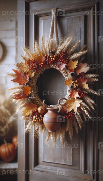 Венок из пшеницы и осенних листьев с миниатюрным глиняным кувшином, Ai generated image