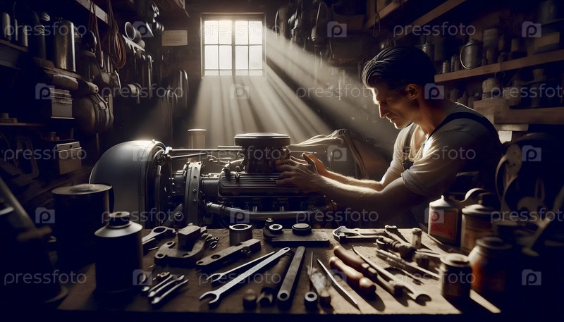 Механик, работающий под поднятым капотом классического автомобиля в пыльном солнечном гараже с разбросанными инструментами и лучами света, прорезающими воздух, создал изображение Ай