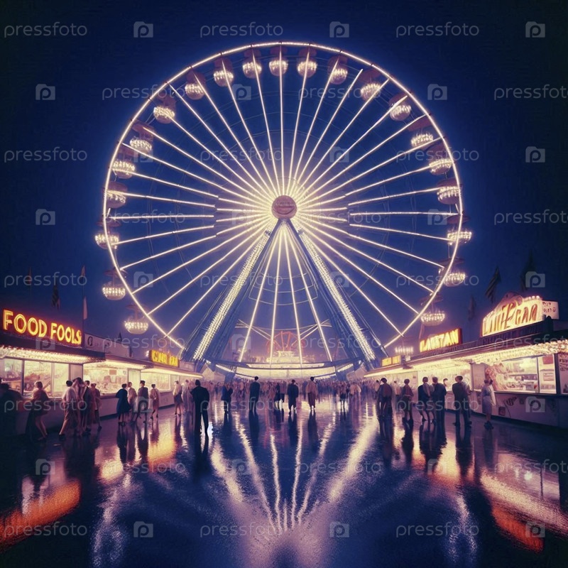 Живая вечерняя сцена на краевой ярмарке, с огнями обозрительного колеса, отражающимися в луже, Ai создала изображение