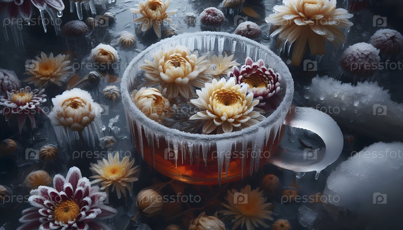 Озеро замороженного чая с встроенными цветами хризантемы, Ai created image