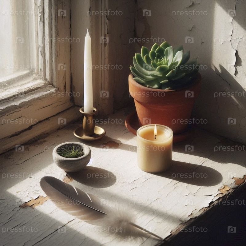 Алтарь на подоконнике со свечой и перьями, Ай создал изображение