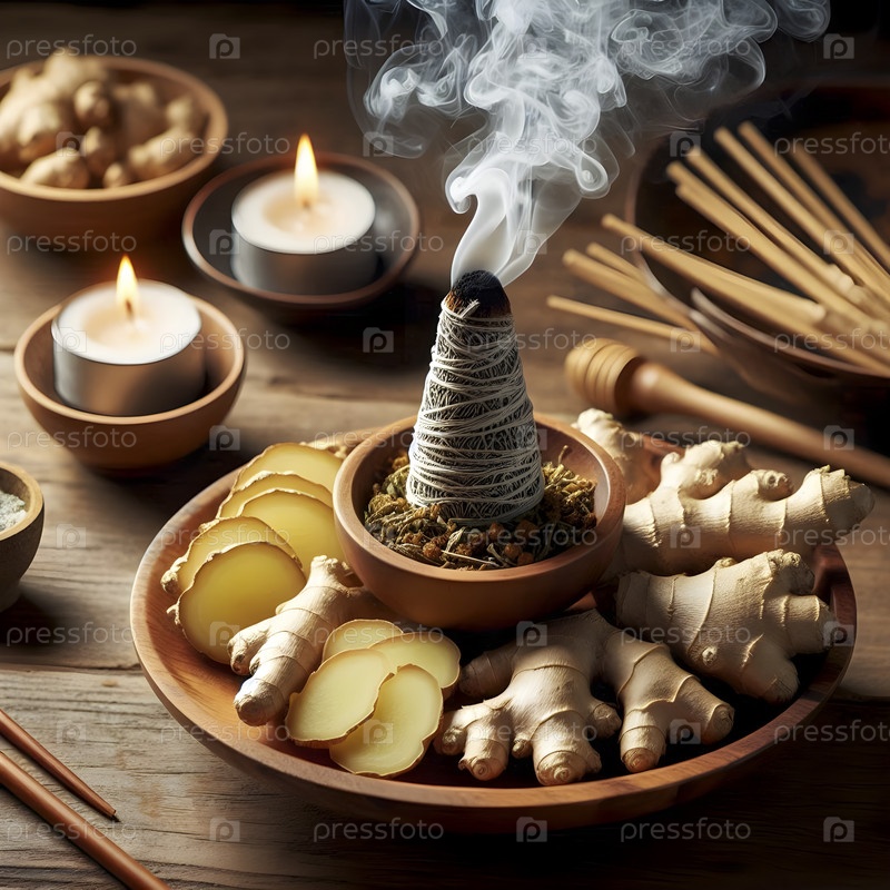 Японское моксибустионное сжигание на кусочках имбиря, Ai created image