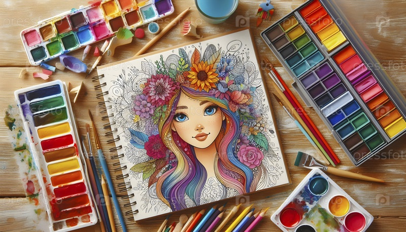 Детский художественный учебник в окружении карандашей, акварельных красок, Ai created image