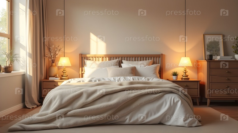 Уютная спальня, нейтральные тона, image created using Ai