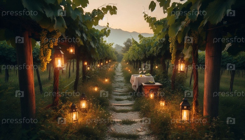 Выросшая тропа виноградника на закате, Ai generated image