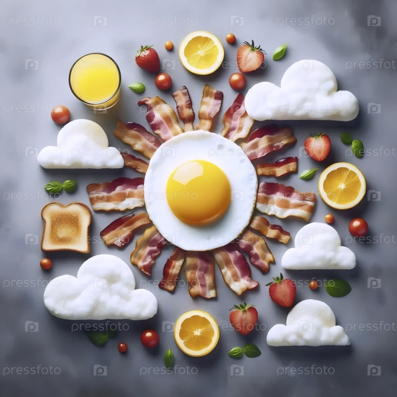 Искусство завтрака с солнечной стороной вверх яйцо как солнце, лучи бекона и облака тостов, Ai created image