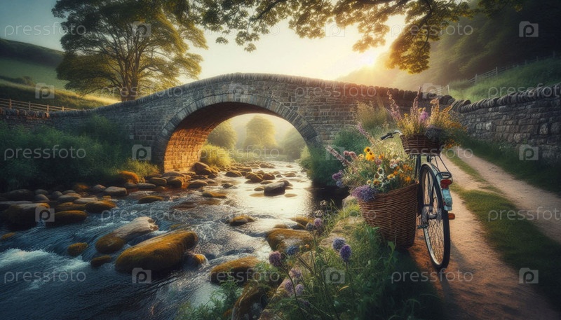 Старый каменный мост через ручьи в волшебные часы, Ai generated image