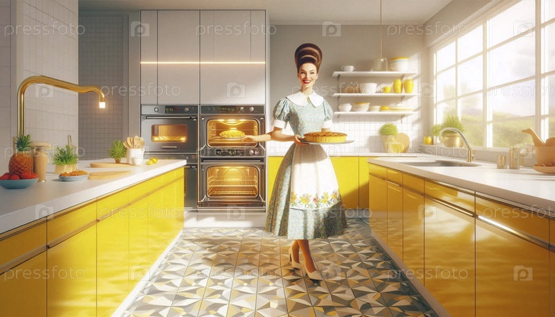Безупречная кухня 1960-х годов с лимонно-желтыми приборами, улыбающаяся домохозяйка, кладящая пирог в современную духовку, Ai generated image
