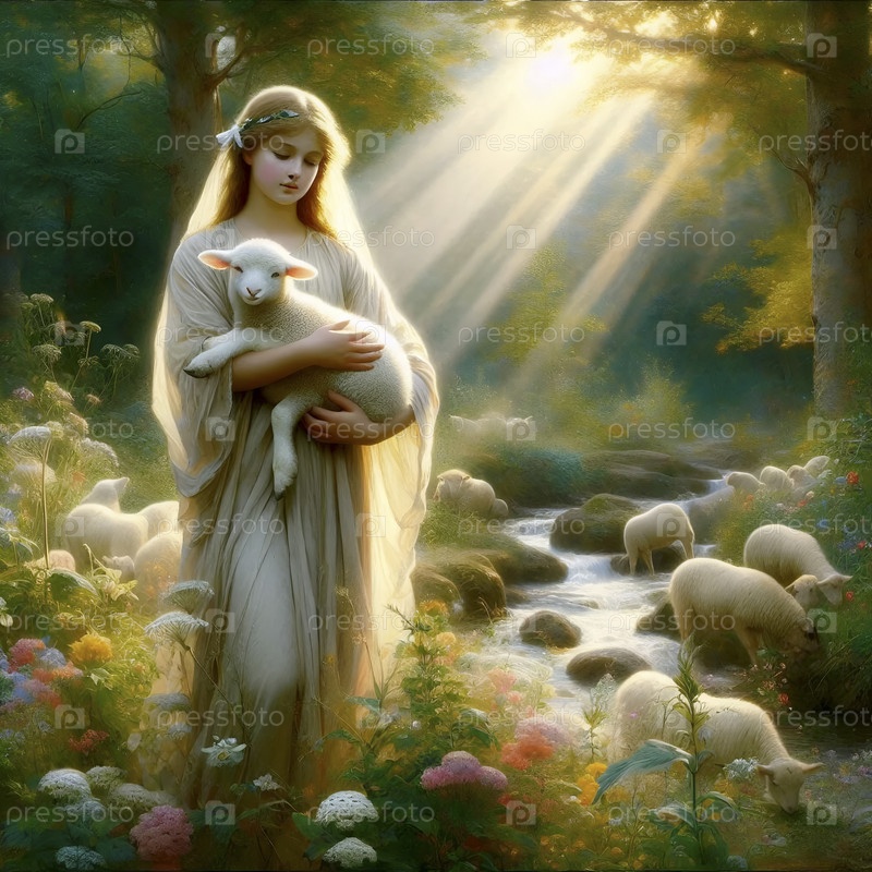 Святая фигура с ягненком в прерафаэлитном пейзаже, Ай создал изображение