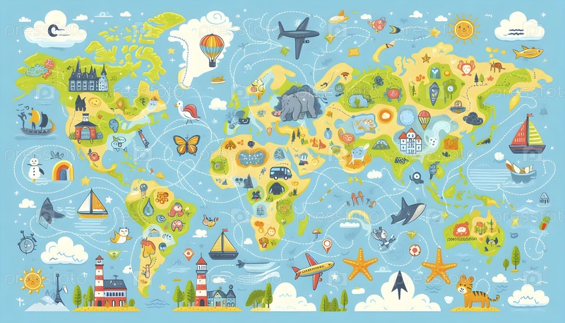 Карта мира детская комната обои с мультфильмами достопримечательностей и животных, Ai created image
