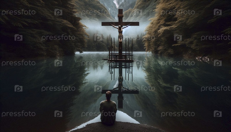 Отражение распятия в тихом озере с фигурой на берегу, Ай создал изображение