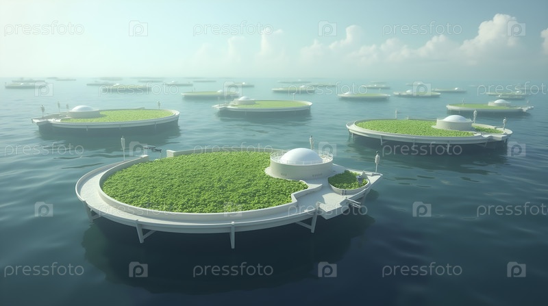 Плавучие капсулы аквакультуры выращивают водоросли для получения биотоплива, Ai generated image