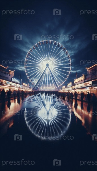 Живая вечерняя сцена на краевой ярмарке, с огнями обозрительного колеса, отражающимися в луже, Ai создала изображение
