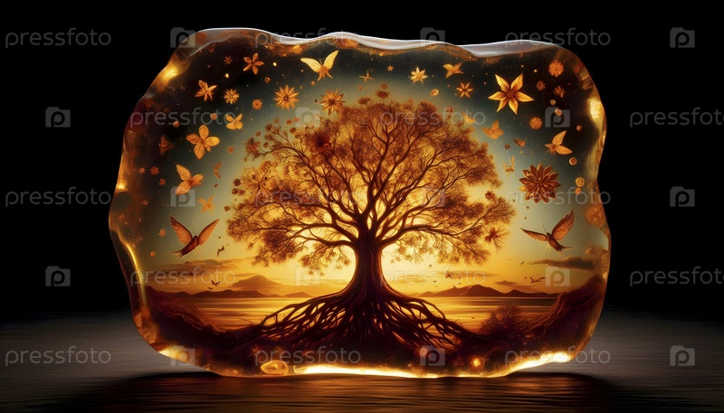 Дерево Жизни выгравировано в плиту из сырого янтаря, Ai created image