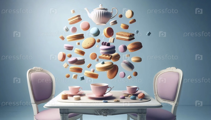 Сюрреалистическая плавучая чайная вечеринка с печеньем и макаронами, висящими в воздухе на пастельном фоне, Ai created image