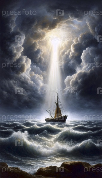 Небольшая лодка в шторме, свет с неба, романтическая гавань для яхт, Ai generated image