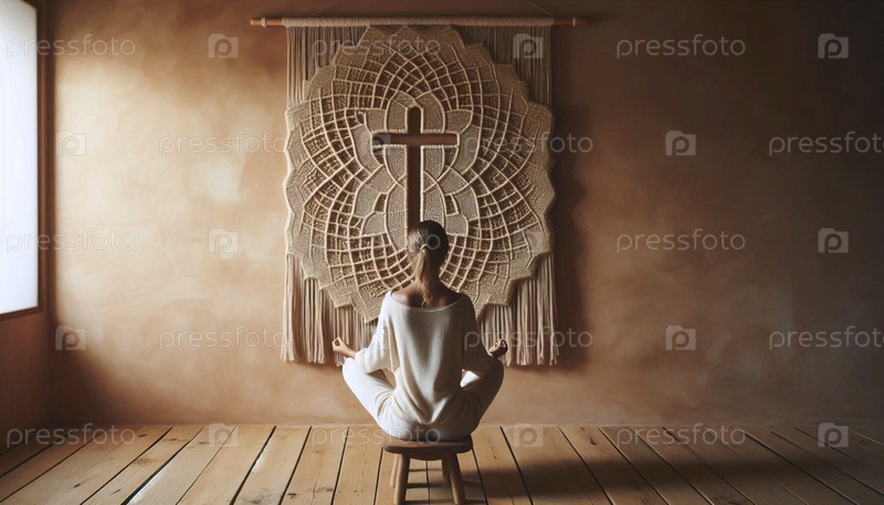Крест, выплетенный в макрамную стену, висящий за сидящей фигурой, Ай создал изображение