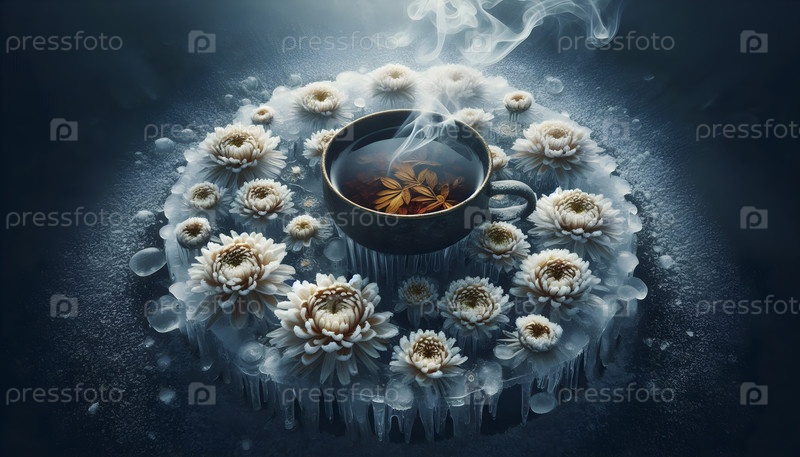 Озеро замороженного чая с встроенными цветами хризантемы, Ai created image