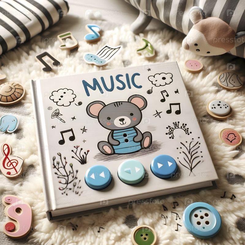 Детская звуковая книга с кнопками для нажатия, размещенная на мягком ковре, Ai created image