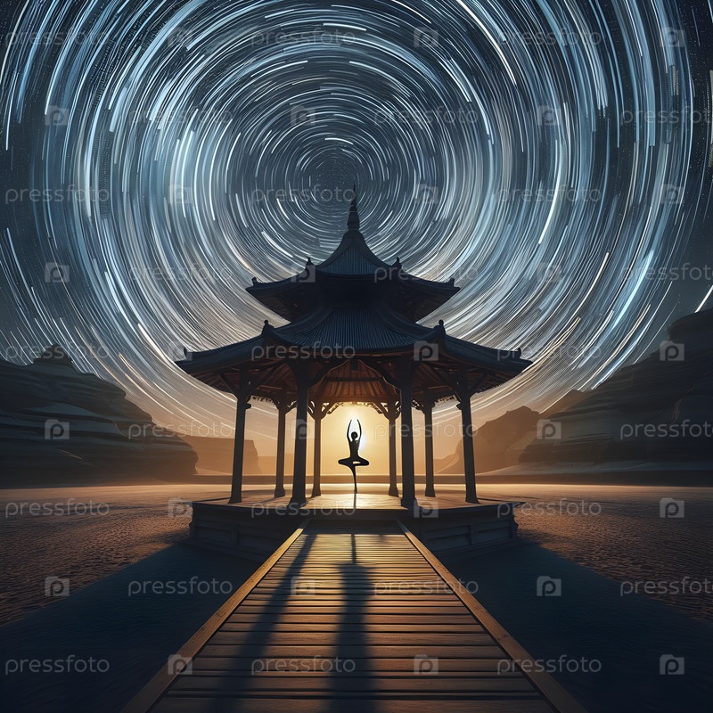 Time-lapse концепция звездных троп над пустынной платформой йоги, Ai created image