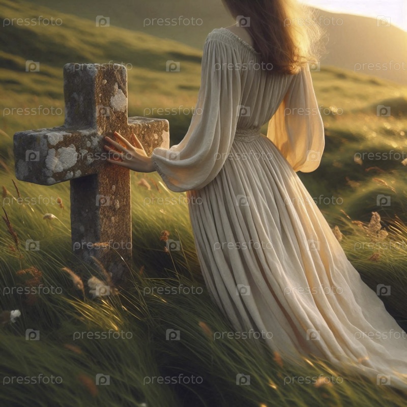 Фигура сзади, касающаяся выветрившийся каменный крест в поле, Ai generated image