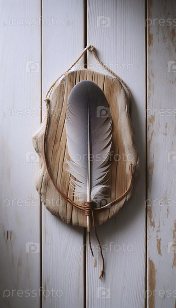 Перо, привязанное кожаным шнуром к куску дерева, Ai generated image