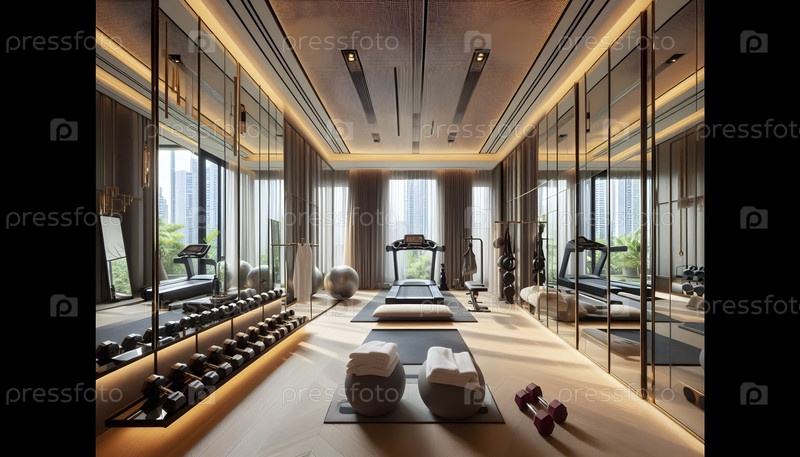 Профессиональный интерьер тренажерного зала с оборудованием для тренировок, Ai created image