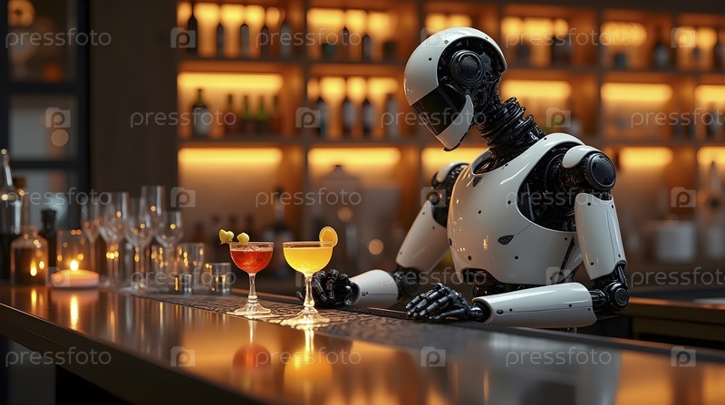 Роботизированный бармен, смешивающий коктейли в высококлассном салоне, Ai generated image