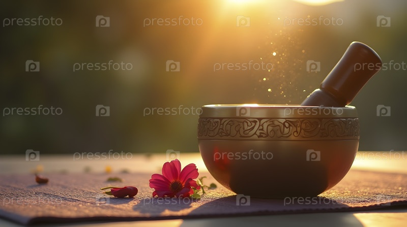 Пустой ковер для йоги рядом с бронзовой певчей миской, AI generated image
