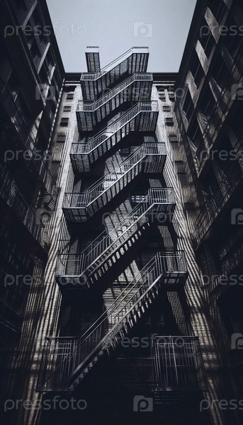 Абстрактные геометрические узоры теней, брошенных пожарной лестницей на строгую кирпичную стену, Ai generated image