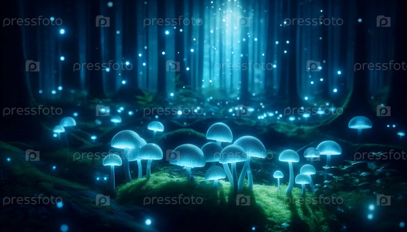 Светящийся биолюминесцентный кластер грибов, Ai generated image