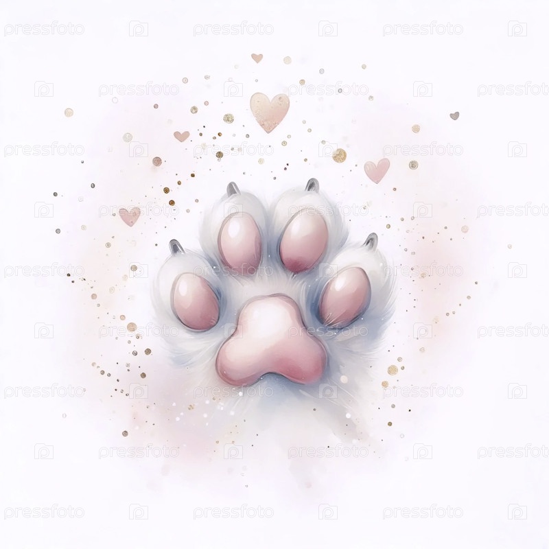 Милый акварель кошачьих лап с сердцами, Ai generated image