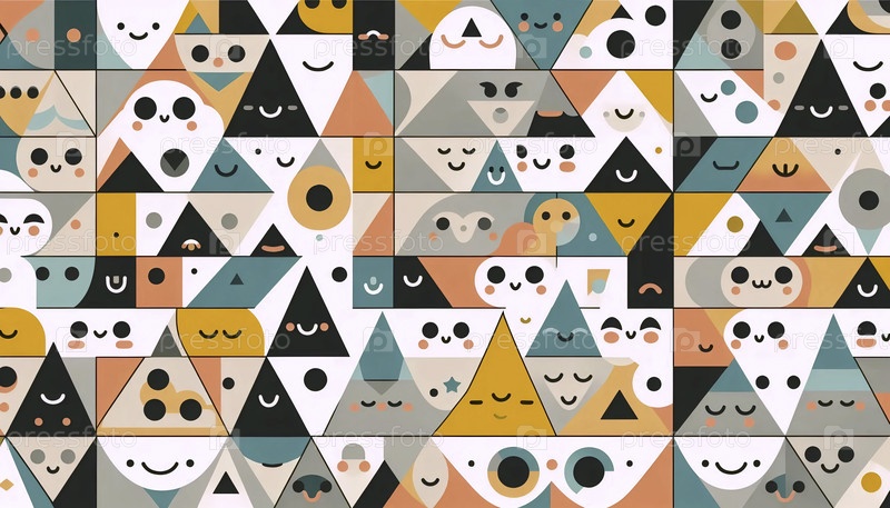 Геометрический шаблон кавайи с милыми формами лиц, Ai generated image