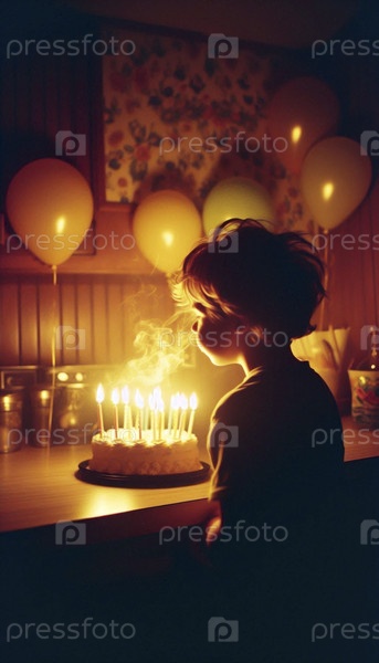 Ребенок дует свечами на домашний торт в кухне 1970-х годов, Ai generated image