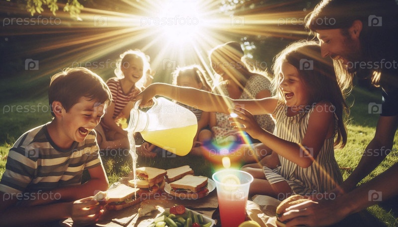 Хаотичный и радостный семейный пикник на квадратном одеяле во дворе 1970-х годов, Ай создал изображение