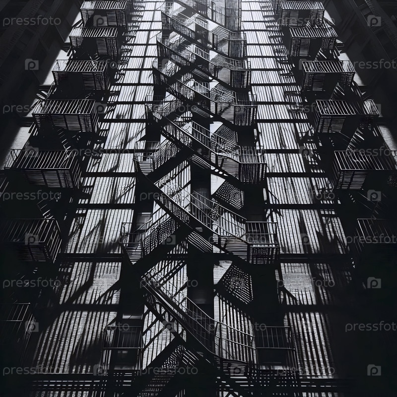 Абстрактные геометрические узоры теней, брошенных пожарной лестницей на строгую кирпичную стену, Ai generated image