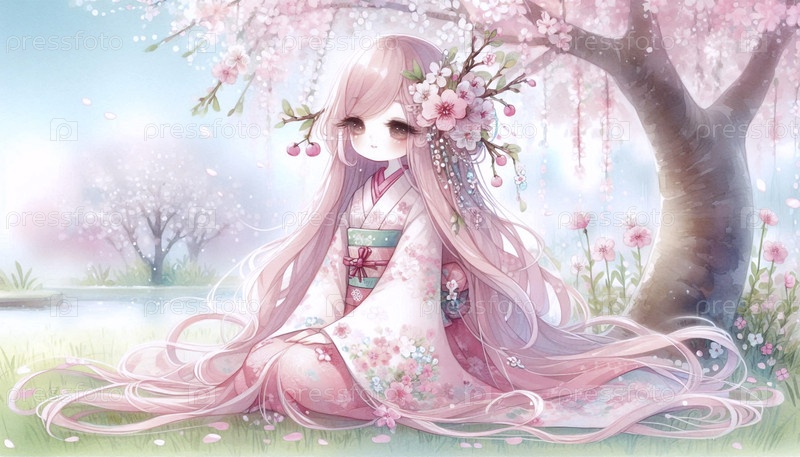 Кавайская сцена девушки, цветущей в вишневом цвете весной, Ai generated image