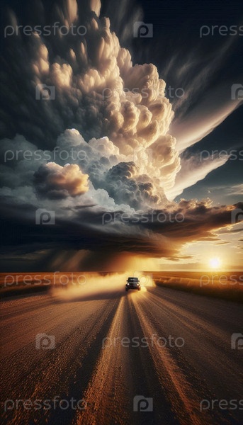 Старый пикап едет по прямой пыльной сельскохозяйственной дороге, которая исчезает на горизонте под монументальным штормовым небом