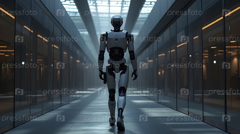 Роботизированный охранник патрулирует высокотехнологичное корпоративное здание, Ai generated image