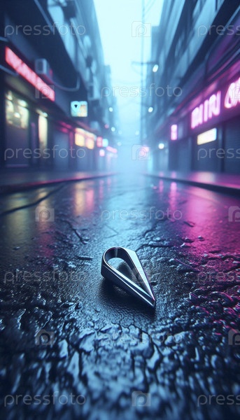 Чистый геометрический макет залога на подвеске, лежащий на дождливом черном асфальте под неоновыми знаками в темной аллее, Ai generated image
