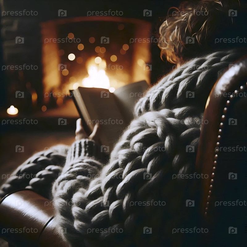 Момент цифровой детоксикации и простой радости, чтение физической книги у трескающегося камина, Ai generated image