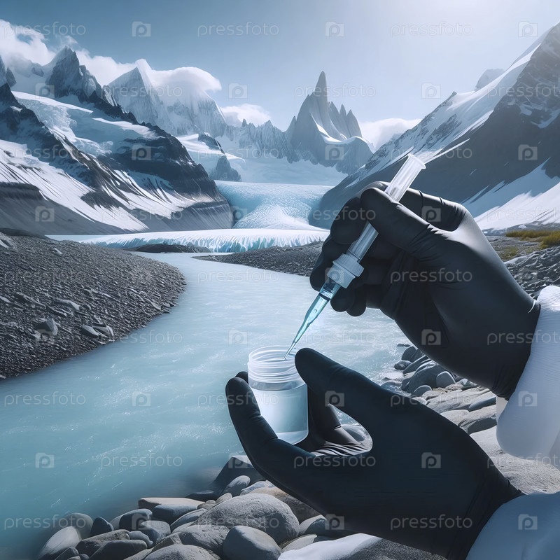 Команда ученых-экологов берет образец воды из нетронутой ледниковой реки, Ai generated image