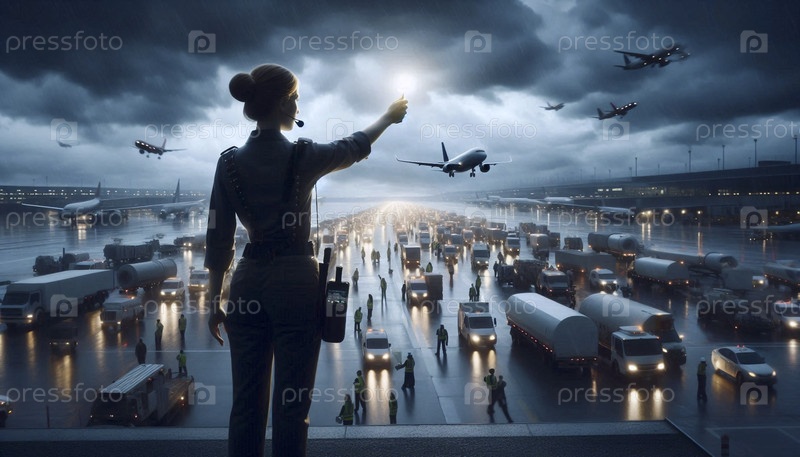 Более широкий, кинематографический снимок окружающей среды на хаотичной переполненной взлетно-посадочной полосе аэропорта во время внезапной задержки шторма Ai создал изображение