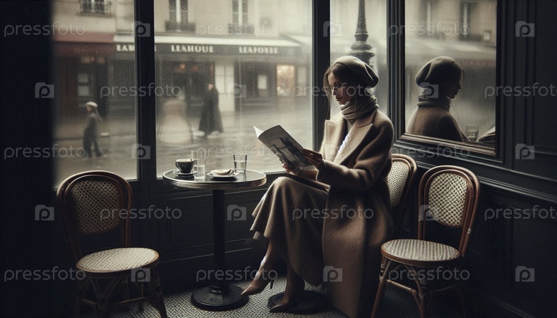 Женщина в верблюжьем пальто в дождливом кафе, Ai generated image
