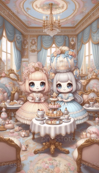 Кавайская сцена чайной вечеринки в салоне рококо, Ai generated image