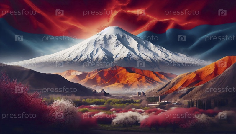 Армянский флаг на древней горе Арарат ландшафт, Ai generated image