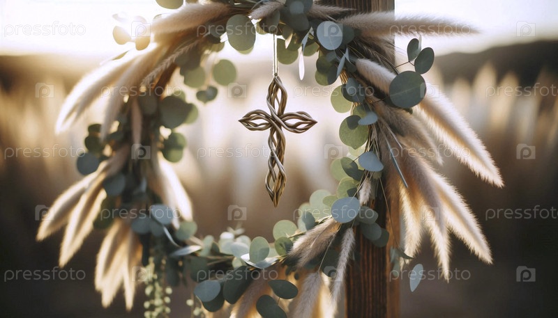 Декор свадебной елки с эвкалиптом, сушеными цветами и подвесным крестом, Ai generated image