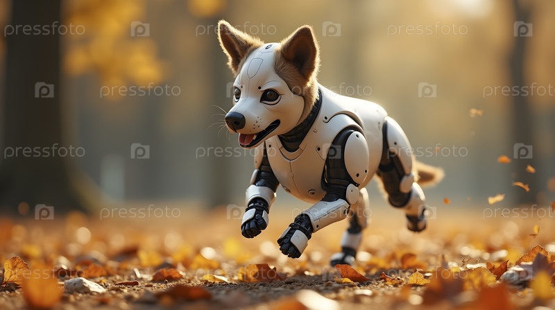 Роботизированная собака играет в поиски в футуристическом парке, Ai generated image