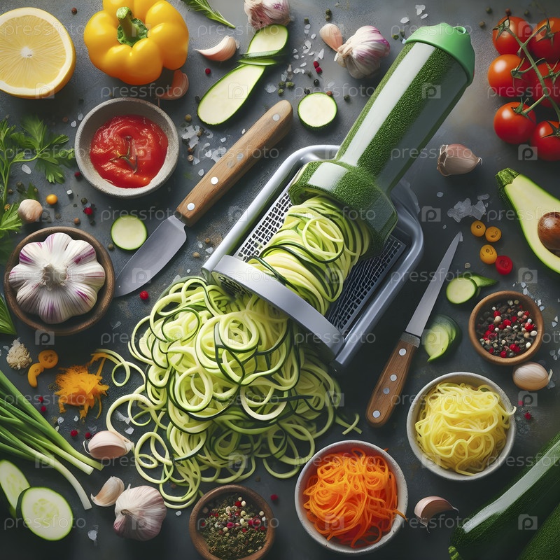 Над головой фотография красочного овощного спирализатора, создающего лапшу из цуккини, Ai created image